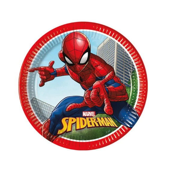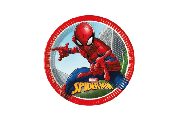 צלחת נייר 9 יום הולדת ממותגת - ספיידרמן, יום הולדת ספיידרמן,חלק מסט יום הולדת ספיידרמן הכולל: צלחת ספיידרמן,כוס ספיידרמן, מפיות ספיידרמן,קופסאת פופקורן וחטיפים ספיידרמן, קופסאת מתנות מנייר ספיידרמן, שקית מתנות מנייר ספיידרמן