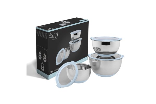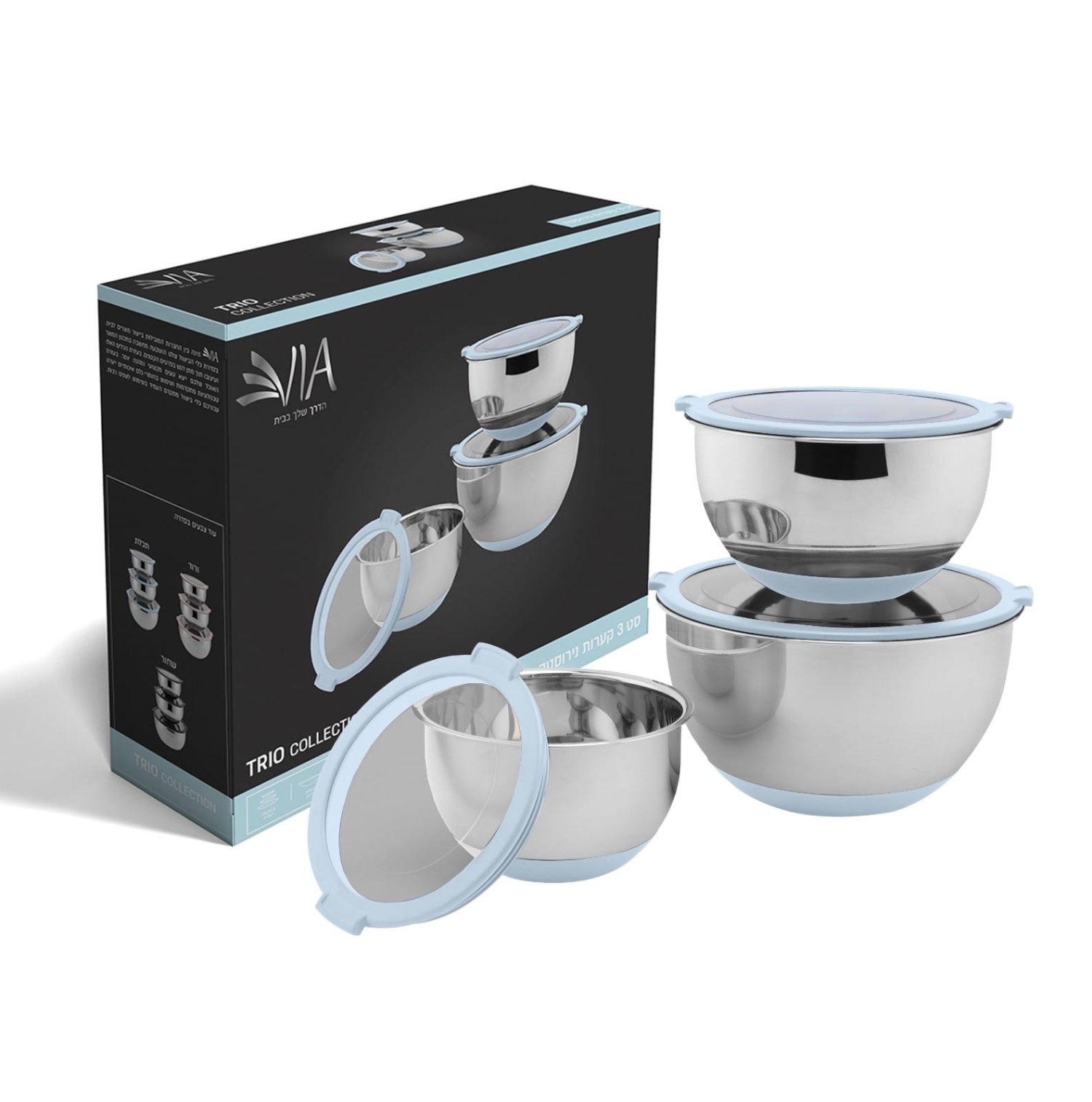 סט 3 קערות נירוסטה עם מכסה אטום - תכלת