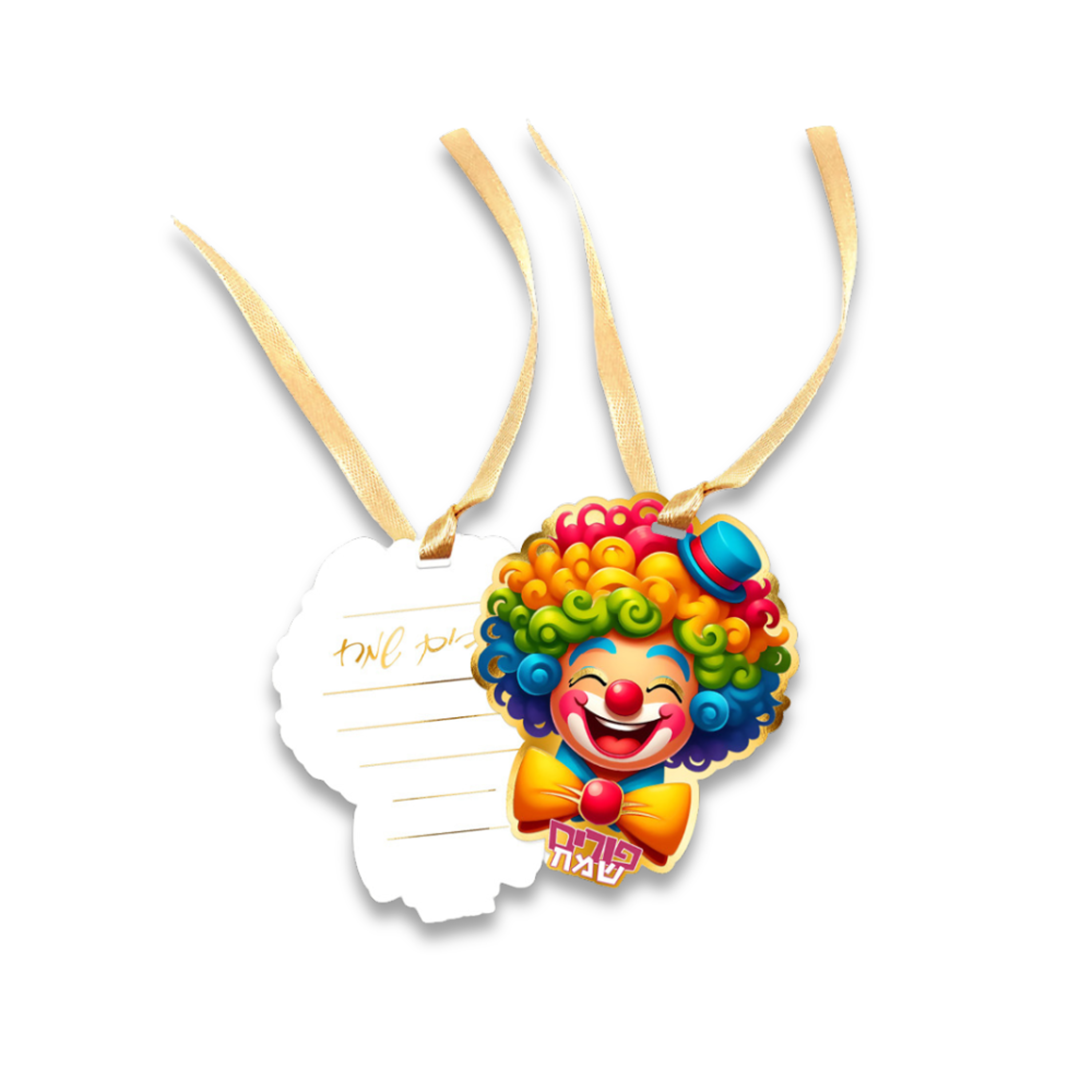 כרטיס ברכה ליצן לפורים עם סרט בצבעים שמחים.