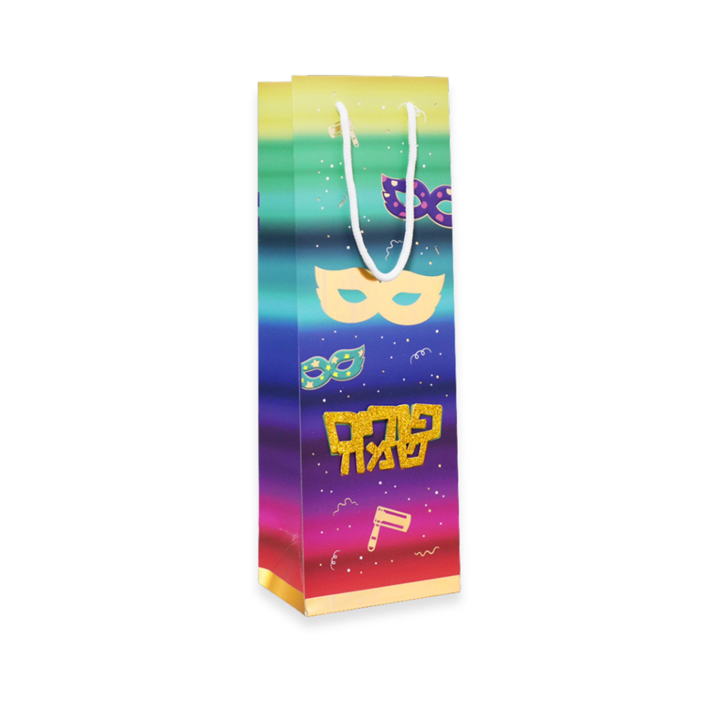 שקית נייר איכותית צבעונית לבקבוק יין עם הכיתוב “פורים שמח”.