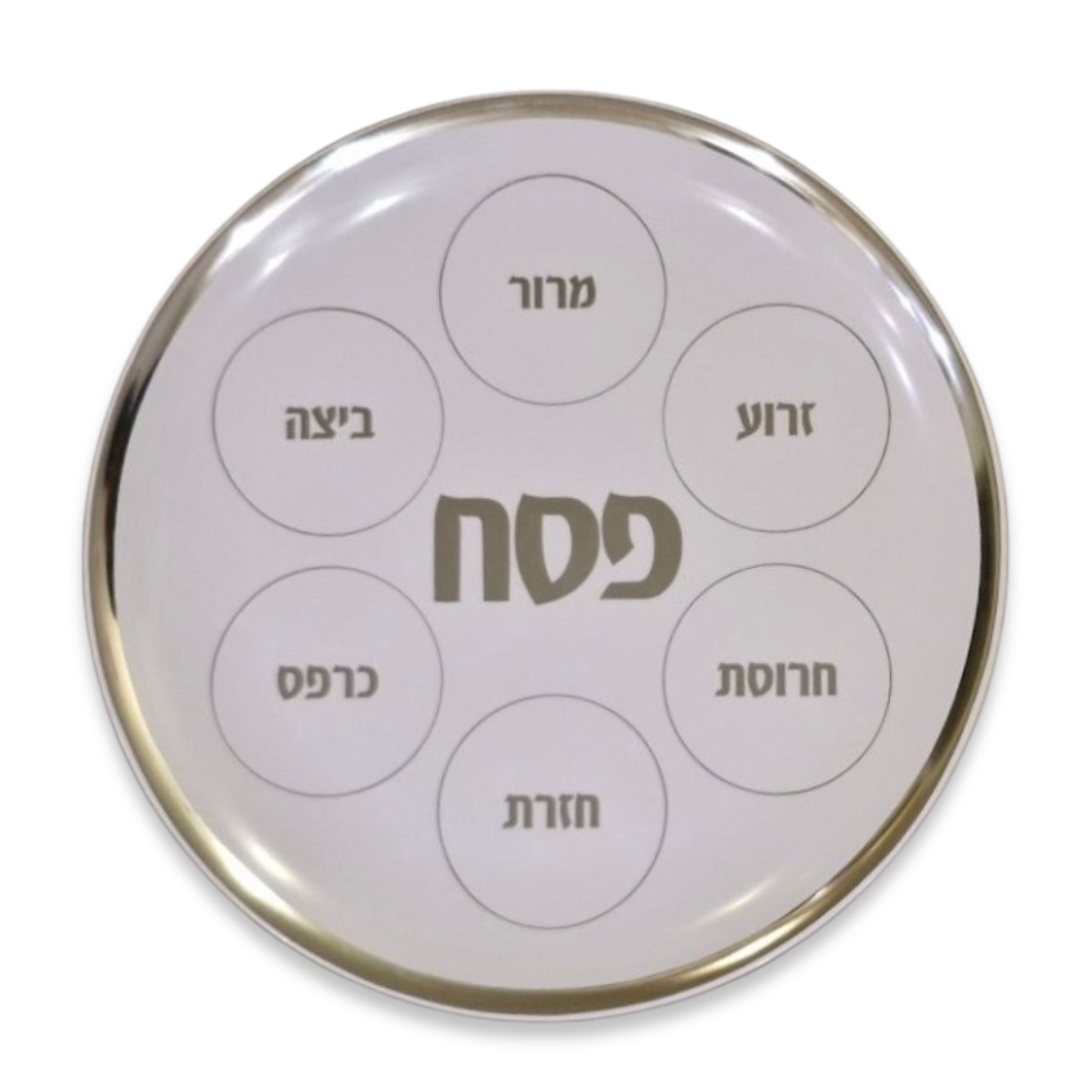 קערת סדר לפסח עשויה פלסטיק בצבע לבן בגימור כסף אלגנטי.