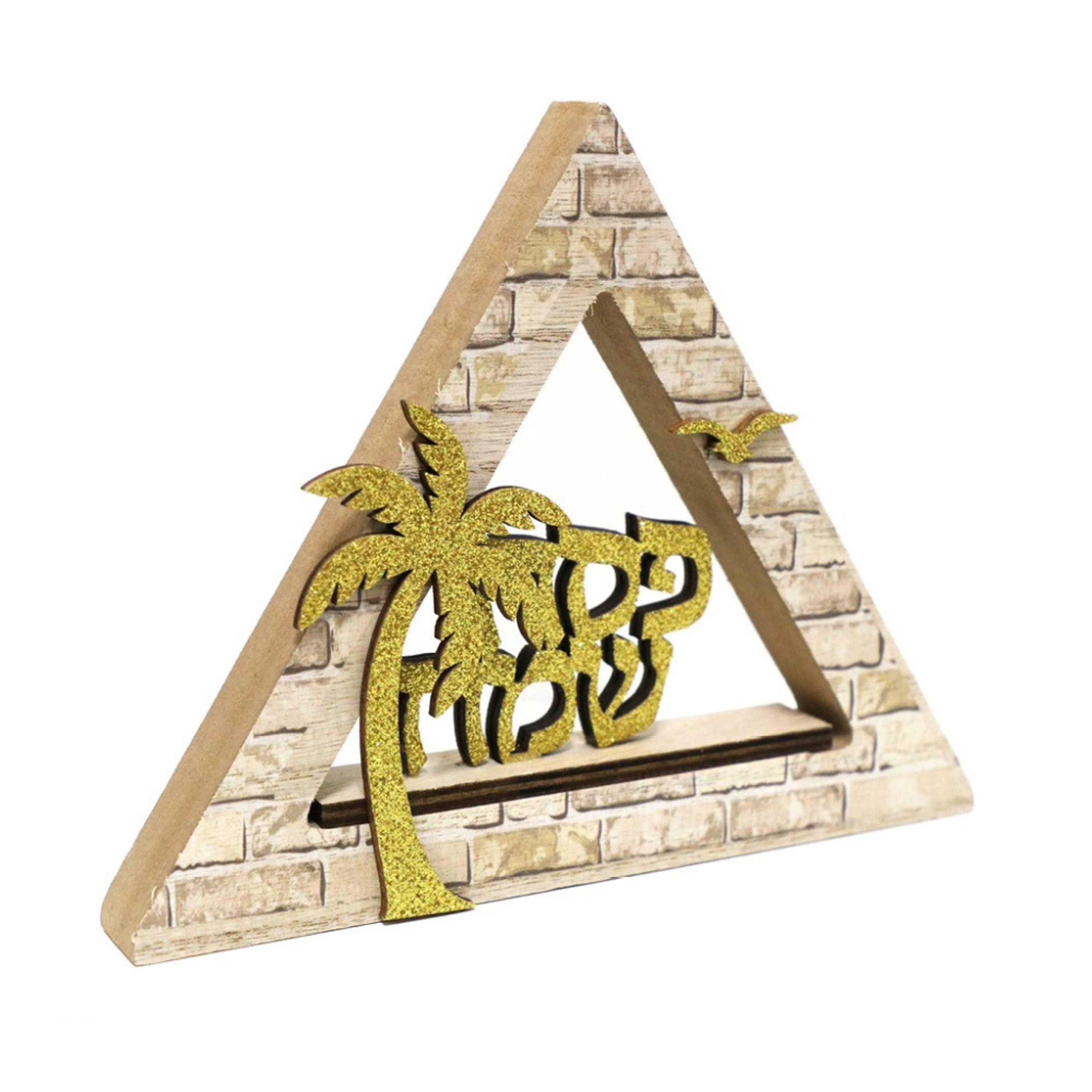 מרכז שולחן בצורת פירמידה מעץ, עם כיתוב פשח שמח בזהב,