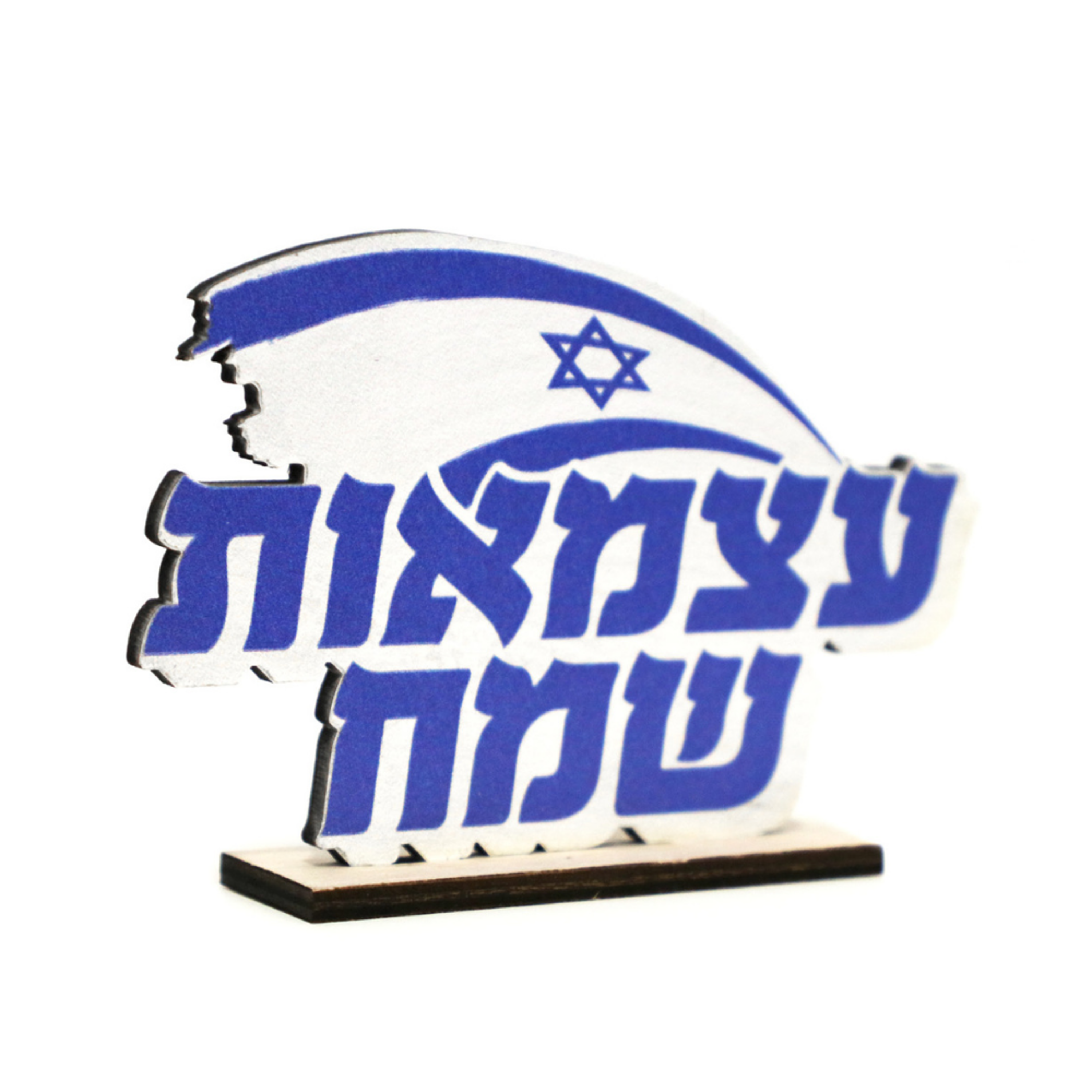 מרכז שולחן עשוי עץ בצבע כחול עם הכיתוב "עצמאות שמח", מוסיף טאץ’ חגיגי ומיוחד לשולחן האירוח.